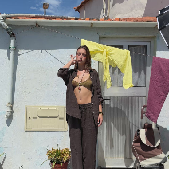 Conjunto Camisa e Calças Linho em castanho. Camisa aperta com botões, tem manga 2/3. Tecido em linho leve e fluído. Calças com elástico na cintura e bolsos. Veste confortavelmente do S ao XL.