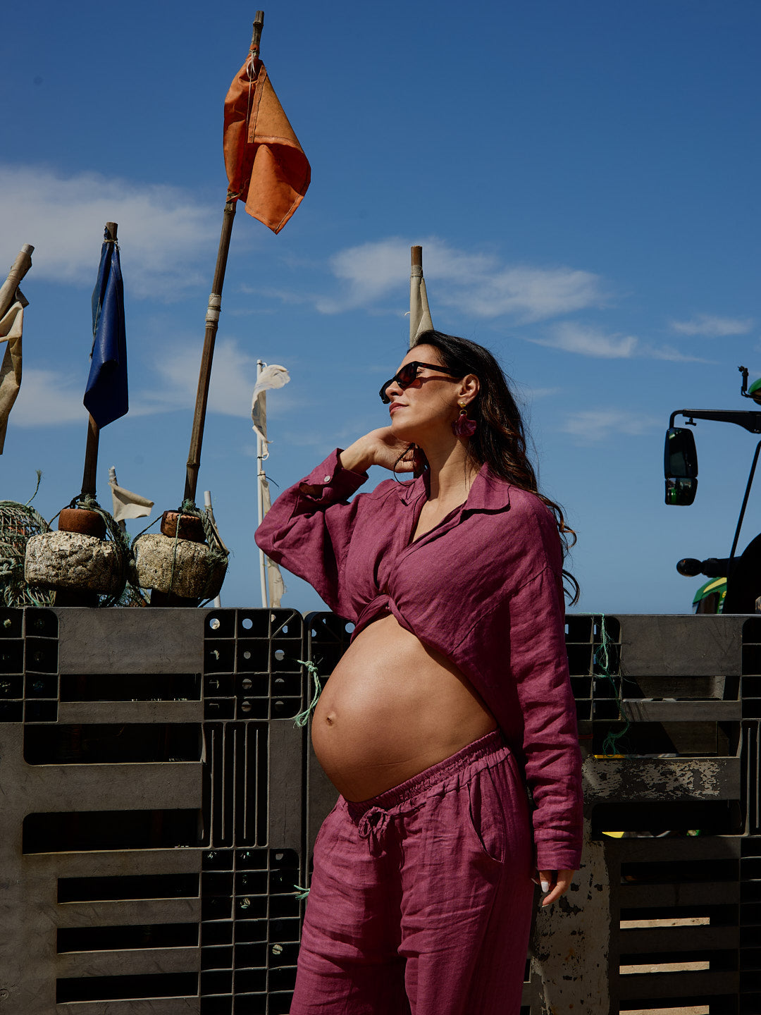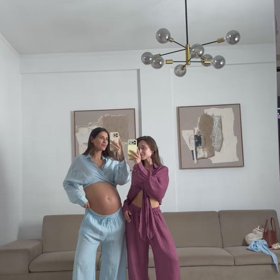 Cada peça em linho é tingida manualmente, tornando cada conjunto único. Pequenas variações de tom entre o top e as calças podem ocorrer naturalmente, refletindo o processo artesanal.