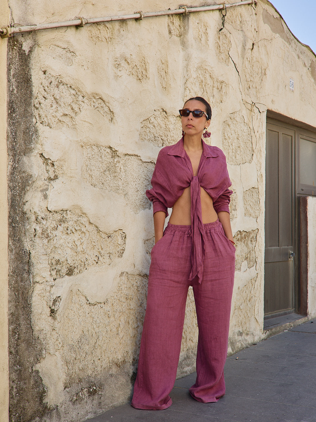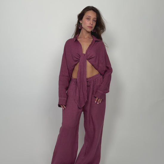 Conjunto Camisa Cropped Nó e Calças Linho em tom beringela. Camisa efeito cropped, com mangas, decote em V e aperta com nó à frente. Tecido em linho leve e fluído. Calças com elástico na cintura e bolsos. Veste confortavelmente do S ao XL.