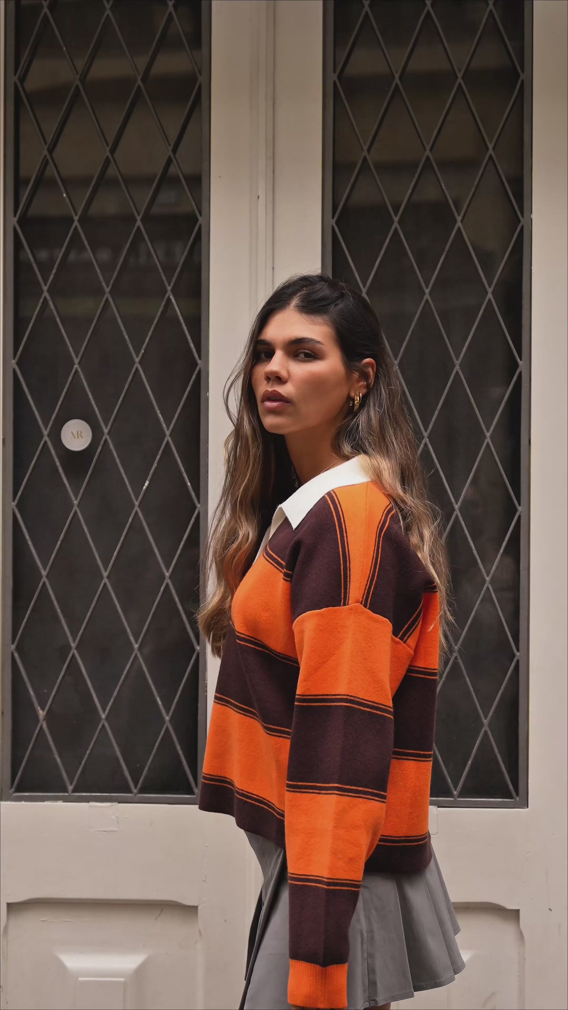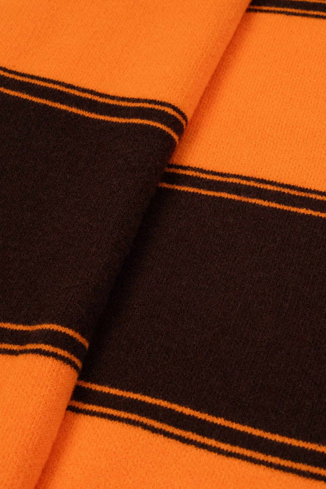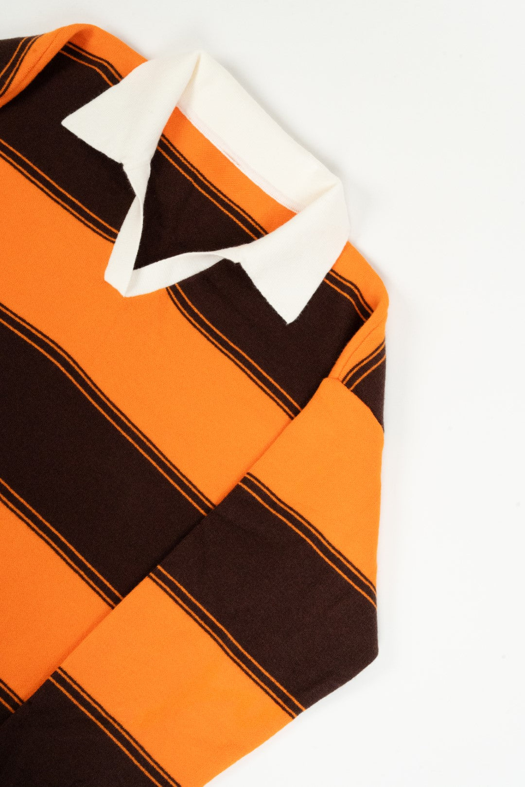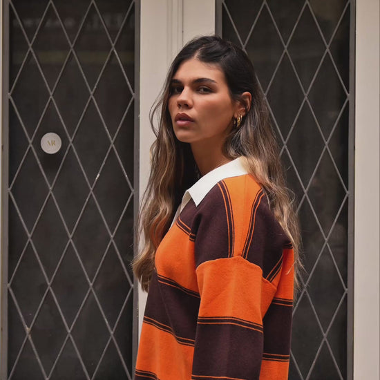 Camisola de gola de polo e manga comprida, com listras largas em laranja e chocolate, com gola em V. Tem elasticidade.