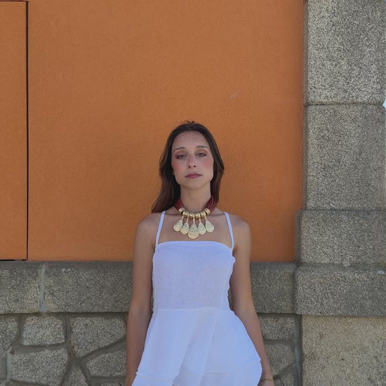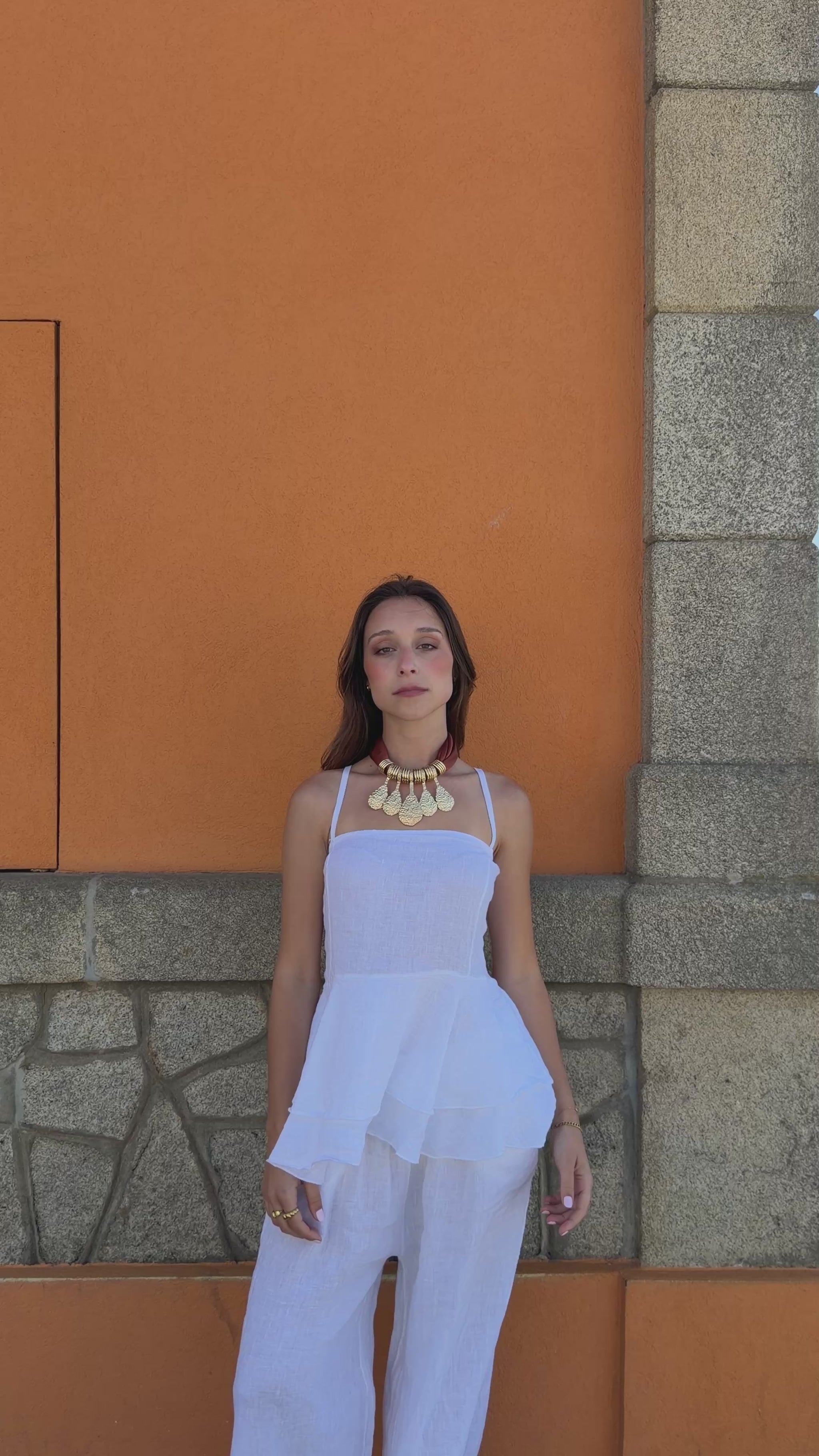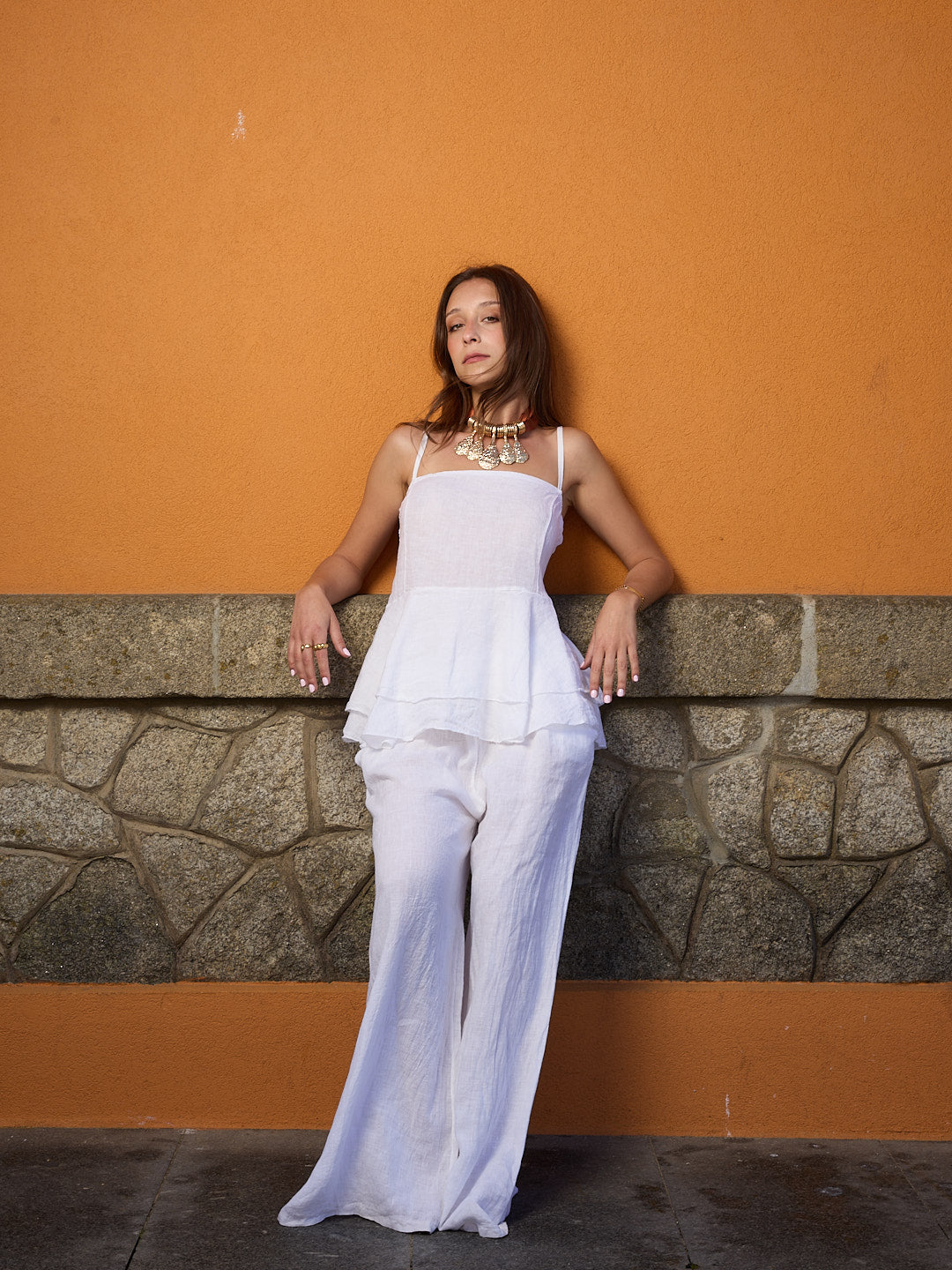 亚麻上衣和裤子套装。也可单独购买。裤子带松紧腰带和口袋。上衣带松紧后背和可调节肩带,A字形效果。