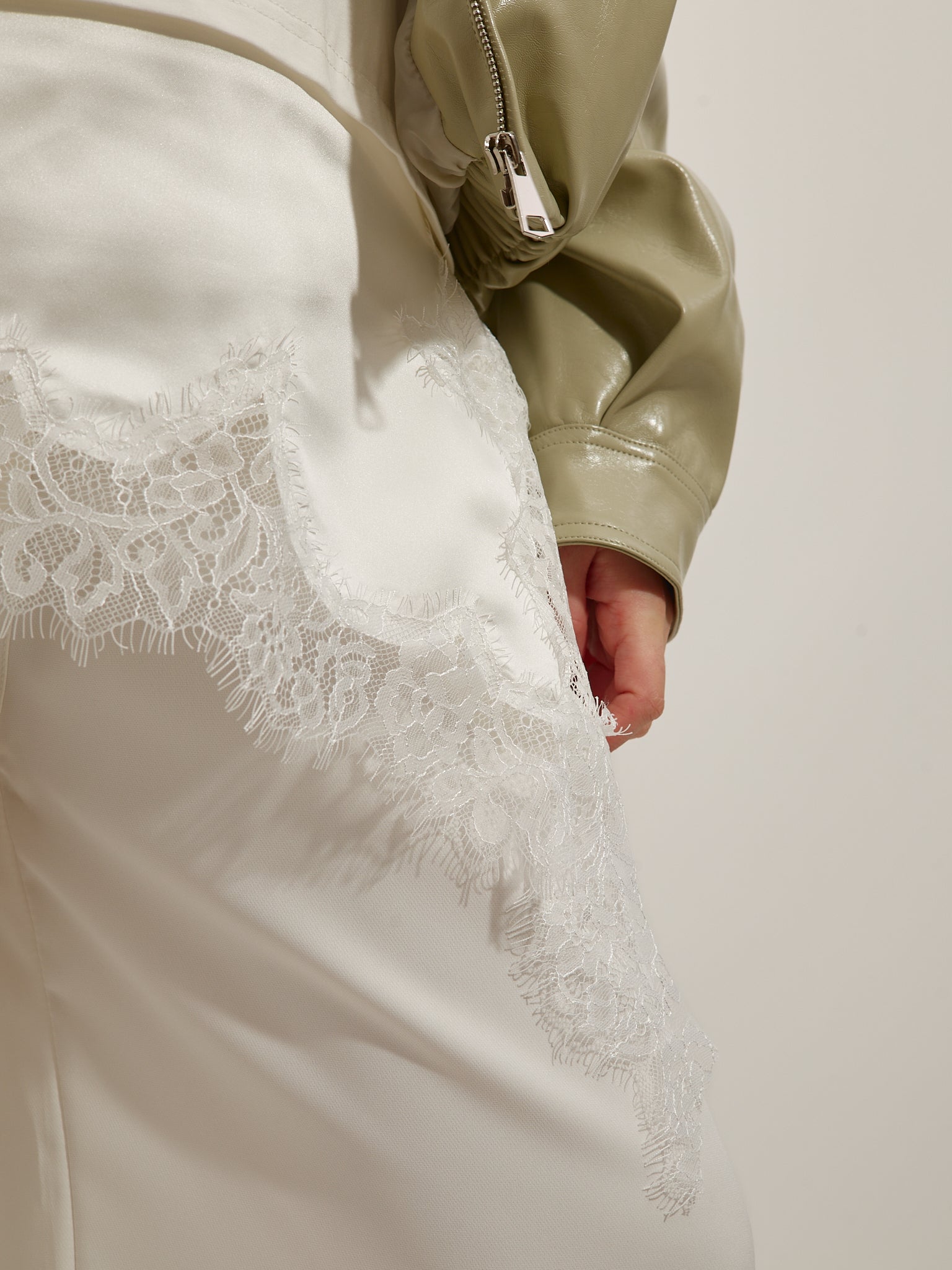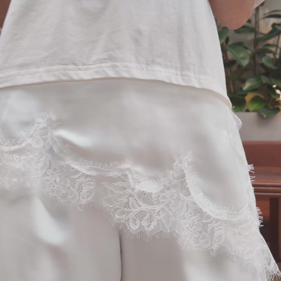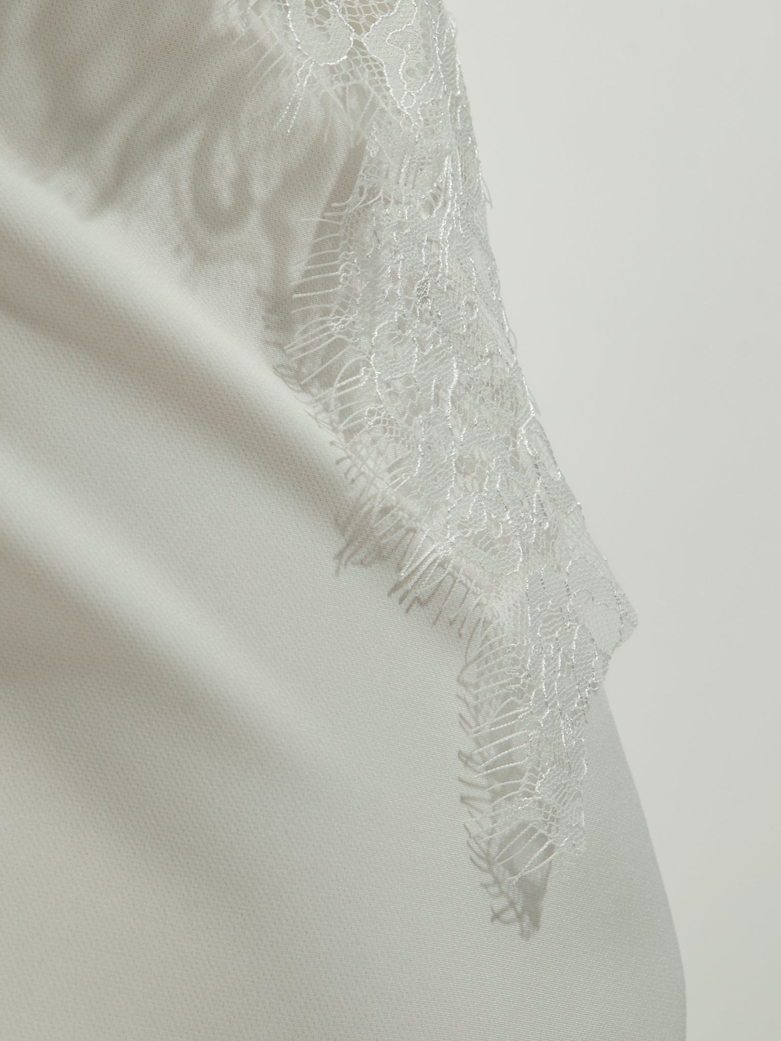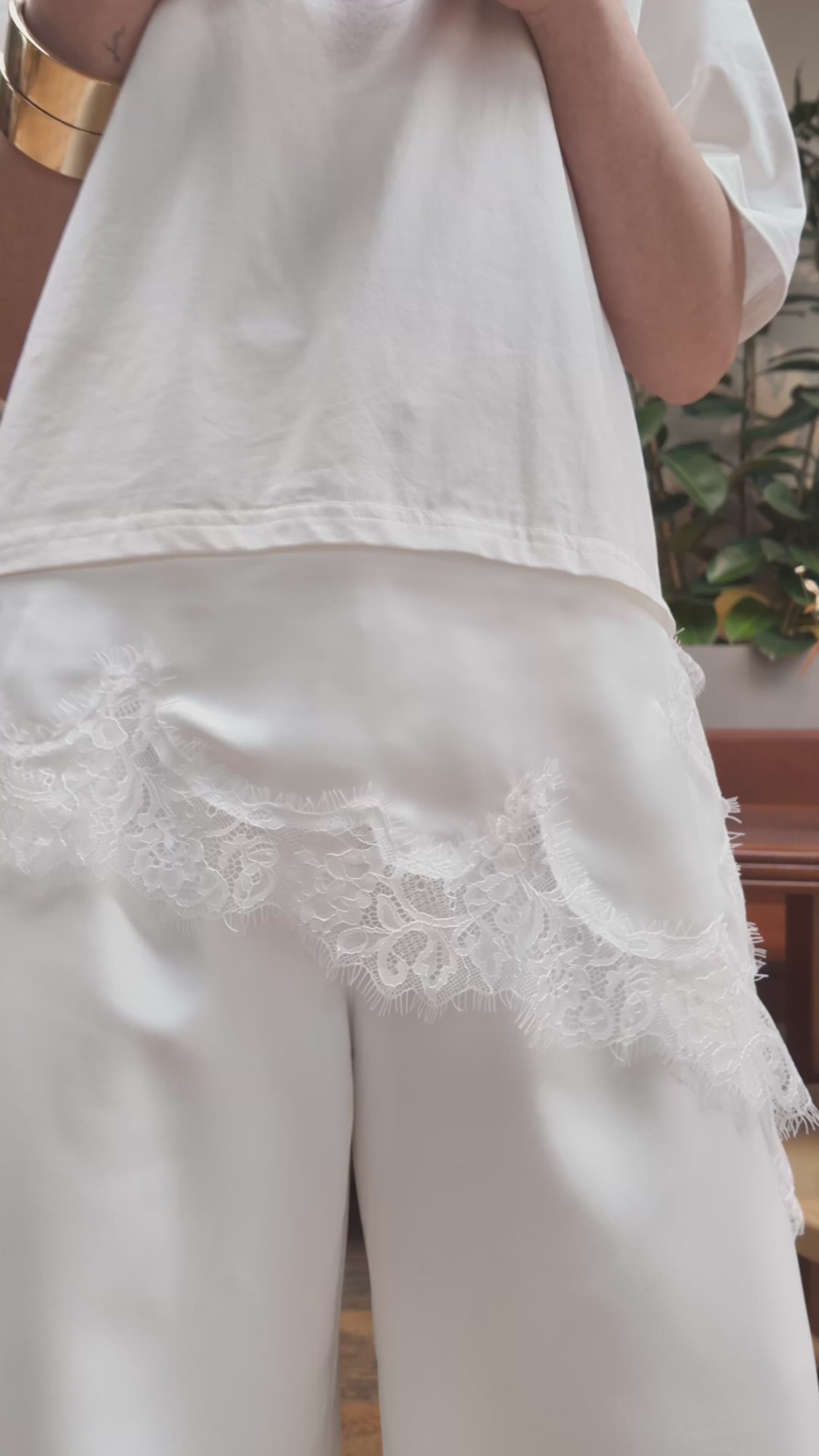 T shirt com decote redondo. Bainha com acabamento em renda com tecido acetinado. Modelo estilo Oversize. Tem elasticidade.